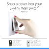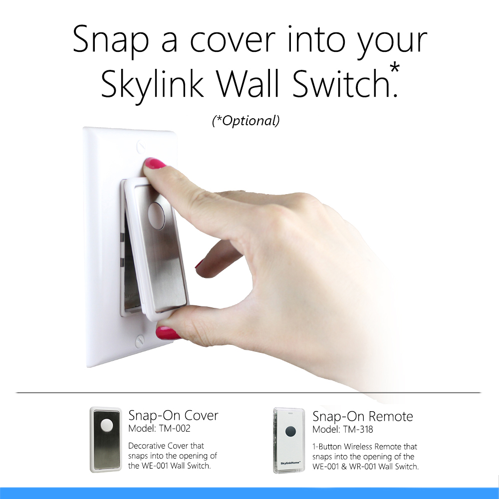 To give the Skylink Wall Switch receiver a more stylish look, snap on a decorative cover, TM-001 (sold separately), to the opening of the Wall Switch receiver. Once the Snap-On Cover has been placed on the opening of the Wall Switch receiver, simply push the button on the cover to turn the lights on/off.
